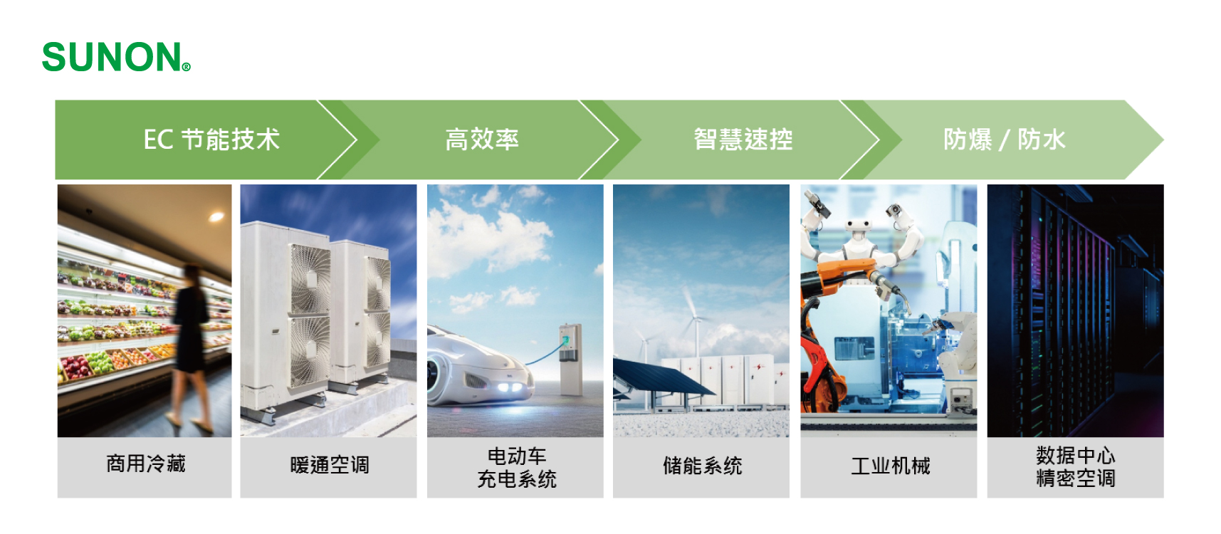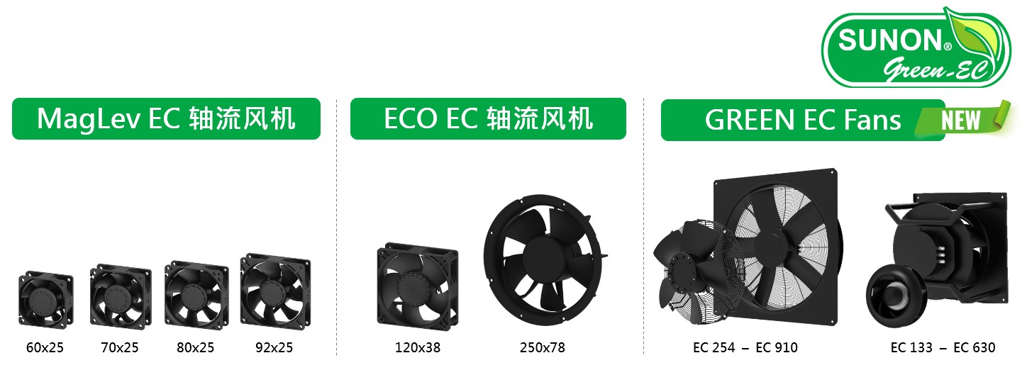 SUNON高效節(jié)能EC風扇將DC風扇直流馬達及轉速控制功能,直接應用于交流電源輸入環(huán)境,并擁有節(jié)能與智慧控制等優(yōu)勢,SUNON高效節(jié)能EC風扇一句不同產(chǎn)業(yè)應用共分為三大系列,小型的MagLev EC、Eco EC 系列,與大型的Green EC 系列。
