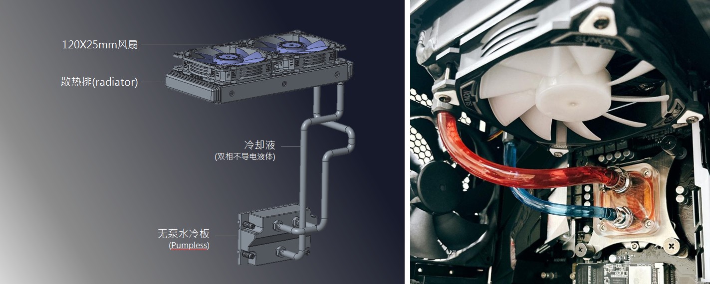 工作站強(qiáng)大的運(yùn)算能力,仰賴高性能多核心的CPU、GPU處理能力,要維持全年無休的高效運(yùn)作則仰賴高可靠度的散熱系統(tǒng);建準(zhǔn)自驅(qū)式相變液冷技術(shù)可以幫助工作站維持良好的工作溫度,且長效、高可靠度的散熱設(shè)計(jì),能降低工作站液冷散熱系統(tǒng)漏水、當(dāng)機(jī)甚至損壞系統(tǒng)的風(fēng)險(xiǎn)。建準(zhǔn)自驅(qū)式相變液冷技術(shù)藉助流體相變化的壓力與密度差異產(chǎn)生對流,將CPU、GPU、DCU產(chǎn)生的熱垂直輸送到散熱排(radiator),再搭配高效散熱風(fēng)扇將高溫液體降溫并將已汽化的蒸汽凝結(jié)成液態(tài)后送回原處,形成一個(gè)快速的散熱循環(huán);透過雙相不導(dǎo)電液體的汽化與凝結(jié)過程就足以維持液體的流動(dòng)形成循環(huán)散熱,無需泵浦,除提高系統(tǒng)的可靠度,更具有降低成本、降低噪音、降低震動(dòng)、降低故障與更容易維護(hù)的優(yōu)勢;另在冷卻介質(zhì)的選用,建準(zhǔn)更是重視良好的物質(zhì)兼容性避免設(shè)備故障,不導(dǎo)電、不可燃,更不會(huì)破壞臭氧層,全球暖化潛值低(Low GWP)。以一個(gè)工作站中需要快速解熱的顯示芯片(GPU, TDP 450W)應(yīng)用為例,僅需240mm散熱排(radiator)搭配2顆120X25mm風(fēng)扇的自驅(qū)式相變液冷散熱器內(nèi)含環(huán)保安全的冷卻液(GWP =2)即可以維持工作站長時(shí)間不降頻的高效穩(wěn)定運(yùn)轉(zhuǎn)。
