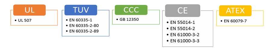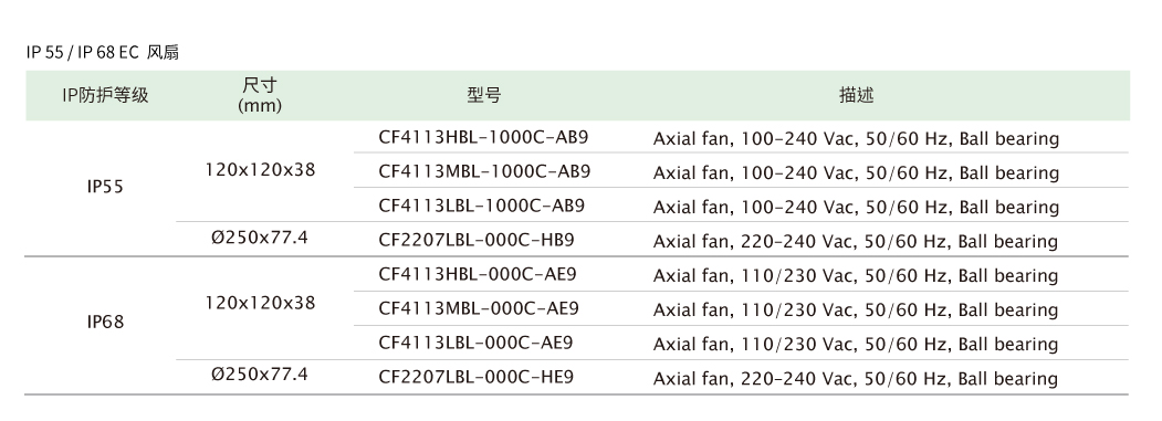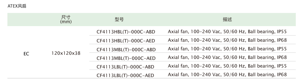SUNON 交流風扇系列具有風量穩定和長效散熱的特性,從60mm~250mm風扇產品廣泛應用于工業設備、商業設備、冷凍冷藏、醫療設備等。近年來在節能產品發展趨勢下,也發展一系列ECO-EC風扇,采用高效馬達搭配各種控制功能,以達到降低能源消耗的設計需求。并可依客戶系統使用于各種嚴苛環境,提供各種防護等級IP21~IP68防水防塵與ATEX 防爆防護。我們不僅提供專業的產品服務以保障產品長效使用、安全可靠性,同時提供高質量和高效率的最適化交流風扇解決方案以滿足各產業的散熱需求。 超省電 全程轉速管控 在交流風扇應用中,暖通空調、冷凍冷藏、工控等設備均需透過各種控制達到最佳效能與節能的目的,SUNON ECO-EC風扇依應用系統的需求提供不同的控制機制如內建電子回路傳送訊號至客戶系統控制端,隨時偵測散熱風扇的運轉情況;數字控制(PWM)調速設計,實時調整設備使用當下的最佳散熱狀態,有效減少不必要的能源消耗。 大風量 扇葉優化設計 SUNON EC風扇透過專業的扇葉優化設計軟件,仿真優化扇葉的曲度和面積,設計各種不同風量與風流的產品。新一代EC 風扇更更大的扇葉曲度設計,提供更集中的風流,也讓氣流吹得更遠,達到風扇整體的散熱效能升級。 長壽命 MagLev 馬達技術 SUNON MagLev EC風扇透過卓越磁浮馬達的垂直磁浮引力系統,馬達運轉達到定點定軌的穩定運轉軌道,重心穩定較不易搖晃震動,減少軸心與軸承接觸摩擦,再配合VAPO軸承技術,材料和結構皆經強化處理,改善普遍SLEEVE軸承不耐高溫的缺點,讓風扇達到低振動、低噪音、長壽命的多項優點。 MagLev EC風扇應用: 機械設備電控箱、工具機等、醫療實驗室冷藏設備、商用冷凍冷藏、家用冰箱 高等級IP55 & IP68防水防塵風扇 SUNON提供IP55等級的EC風扇以符合高度潮濕的商用冷凍冷藏系統應用環境的需求,確保散熱風扇在高度潮濕的應用環境下還能長時間穩定運作。另外,SUNON的IP68 EC風扇能應用在戶外嚴苛氣候的設備環境如儲能系統、戶外充電站系統,不受鹽霧侵蝕保障散熱風扇可長效運作,SUNON可依客戶系統環境提供最適化高IP防護的EC風扇散熱方案。 風扇應用: 儲能系統、戶外充電站系統、商用冷凍冷藏系統 防爆ATEX新技術 SUNON防爆AC和EC風扇已取得歐盟ATEX防氣爆認證,亦提供客制化ATEX粉塵爆防護設計服務,能在具潛在爆炸風險的應用環境范圍內,直接對電氣設備的使用提供適當有效的安全裝置保護力。 環境永續意識抬頭,傳統冷藏設備使用的HCFC系列冷媒中的氟氯碳化物會破壞臭氧層,已遭各國禁用或減量使用。新世代冷藏設備陸續轉型,無氟的環保冷媒逐漸取代傳統冷媒,由于環保冷媒多為碳氫鹵化物,在常溫常壓下性質穩定不易起火燃燒,但在不同的環境條件下仍具有爆炸的危險性,SUNON的防爆風扇可符合新世代的冷藏系統的使用安全需求。 同時,散熱風扇具備防爆安全性是國際市場的必要條件,SUNON防爆風扇具備無火花防護性*,可應用在具潛在爆炸風險的應用環境如儲能和能源轉換設備系統,當能源系統異常時,可避免造成相關能源系統的損壞或引爆疑慮。另外,SUNON散熱風扇應用在各式工業制造產業內的多數電氣儀器和設備如金屬切割廠等制程,都有可燃粉塵爆炸性的危險,SUNON提供客制化ATEX粉塵爆防護設計服務,保障客戶終端產品的運作質量及使用上安全無虞。 風扇應用: 儲能系統、能源轉換系統、商用冷藏設備工、業制造業 高安全可靠度 符合多項國際安全規范認證 SUNON EC產品銷售各大洲,深知散熱方案使用安全的重要性,為提供海外客戶具高質量防護且無危害性的散熱方案,SUNON EC風扇取得多項國際安規認證項目以符合各海外市場對于輸入產品安全的規范。 風扇品質優化 SUNON EC風扇扇葉采用最適化的材料強度以符合不同應用系統環境溫度的需求,同時強化整體扇葉結構,以確保產品高可靠度。另外,SUNON因應客戶系統不同電壓需求采用泛用型電壓設計(90V~254V),風扇內建自動調節芯片不再需要考慮不同輸入電壓問題,提供客戶系統端的應用便利性。 恒溫性&溫度保護設計 SUNON EC風扇符合商用冷藏設備的適用溫度(-25℃~+70℃),亦提供應用在超低溫的商用冷柜環境(-40℃)的EC風扇方案,穩定散熱以保障冷凍速度快。 SUNON提供多項EC風扇保護設計以確保高質量可靠性,在考慮不同應用環境的電源穩定性,風扇內建電子回路可偵測到系統溫度過高或異常,風扇將自動降低轉速運轉甚至主動停止,避免風扇因過熱而損壞,當故障排除后將恢復正常運作。同時,依客戶端較高溫的應用操作環境如,SUNON EC風扇馬達通過具備絕緣等級F級* (材料零件容許最高溫度為155度)的保護力,確保內部材料不受高溫影響而老化損壞。 SUNON EC風扇系列 應用產業