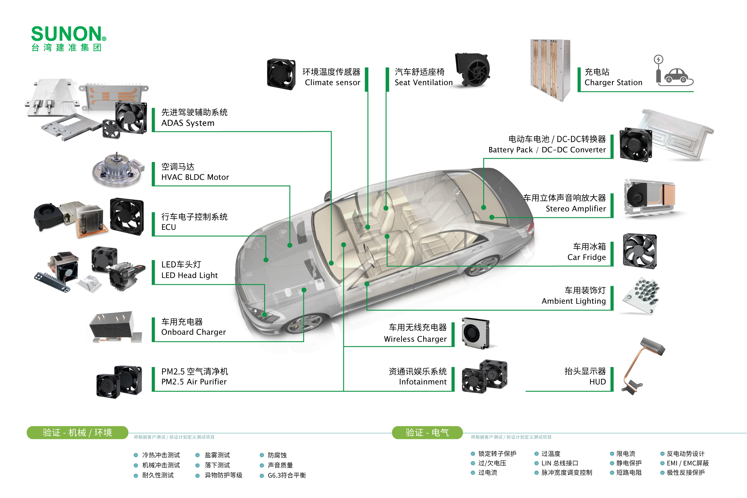 不良的散熱設(shè)計(jì)將嚴(yán)重危及電子產(chǎn)品的可靠度、安全性、耐久性,也會(huì)在行駛中產(chǎn)生不良的噪音與振動(dòng),進(jìn)而影響汽車制造商的產(chǎn)品保固維修與汽車質(zhì)量滿意度等問(wèn)題。SUNON以獨(dú)創(chuàng)DR MagLev防阻微塵磁浮馬達(dá)風(fēng)扇技術(shù),結(jié)合高安全性、高可靠度、高效能產(chǎn)品特色,并通過(guò)耐酸、耐鹽霧GR487驗(yàn)證、1000沙漠地區(qū)測(cè)試、ESD 靜電防護(hù)等嚴(yán)苛測(cè)試,滿足客戶高質(zhì)量的要求